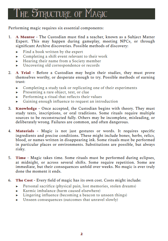 Magic in the Archivium is never free. Rituals demand time, rare materials, or personal sacrifice. As your Custodian advances, the Archive leaves its mark, physically, mentally, or socially.