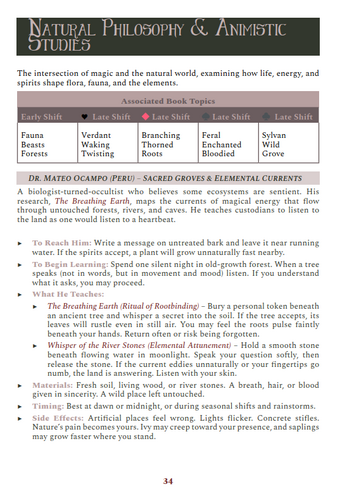 Every field introduces Subject Matter Experts: eccentric academics, disgraced researchers, or strange presences willing to teach. Each comes with signature rituals, requirements, and consequences. -